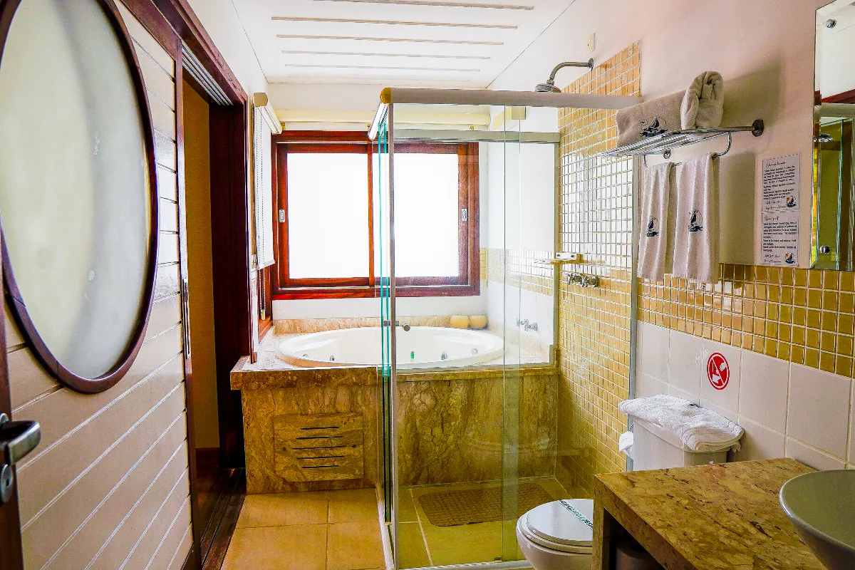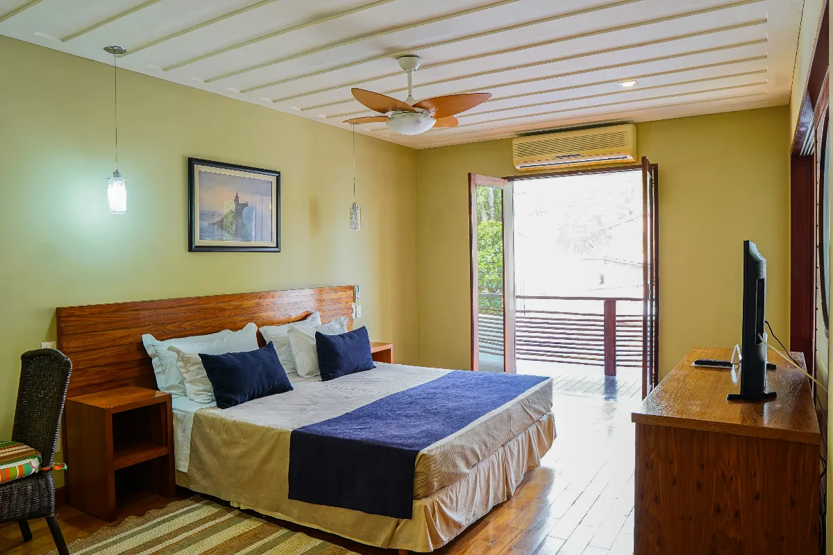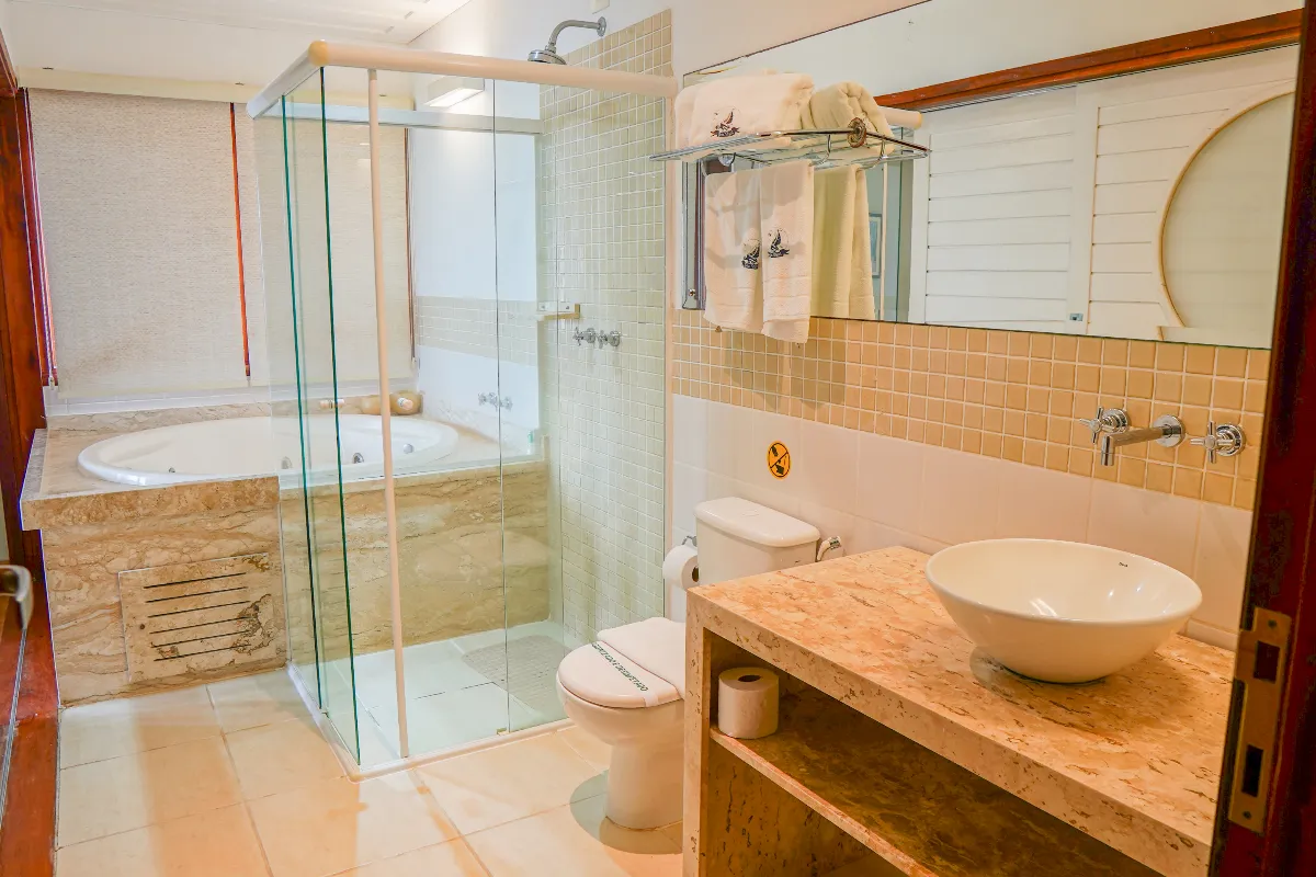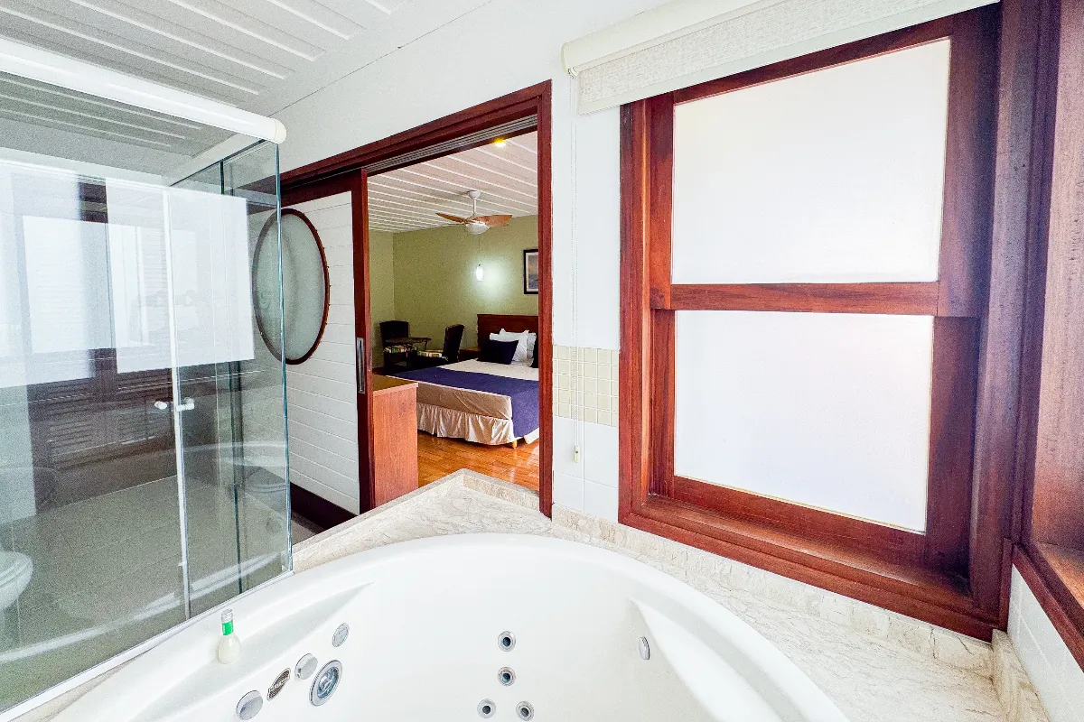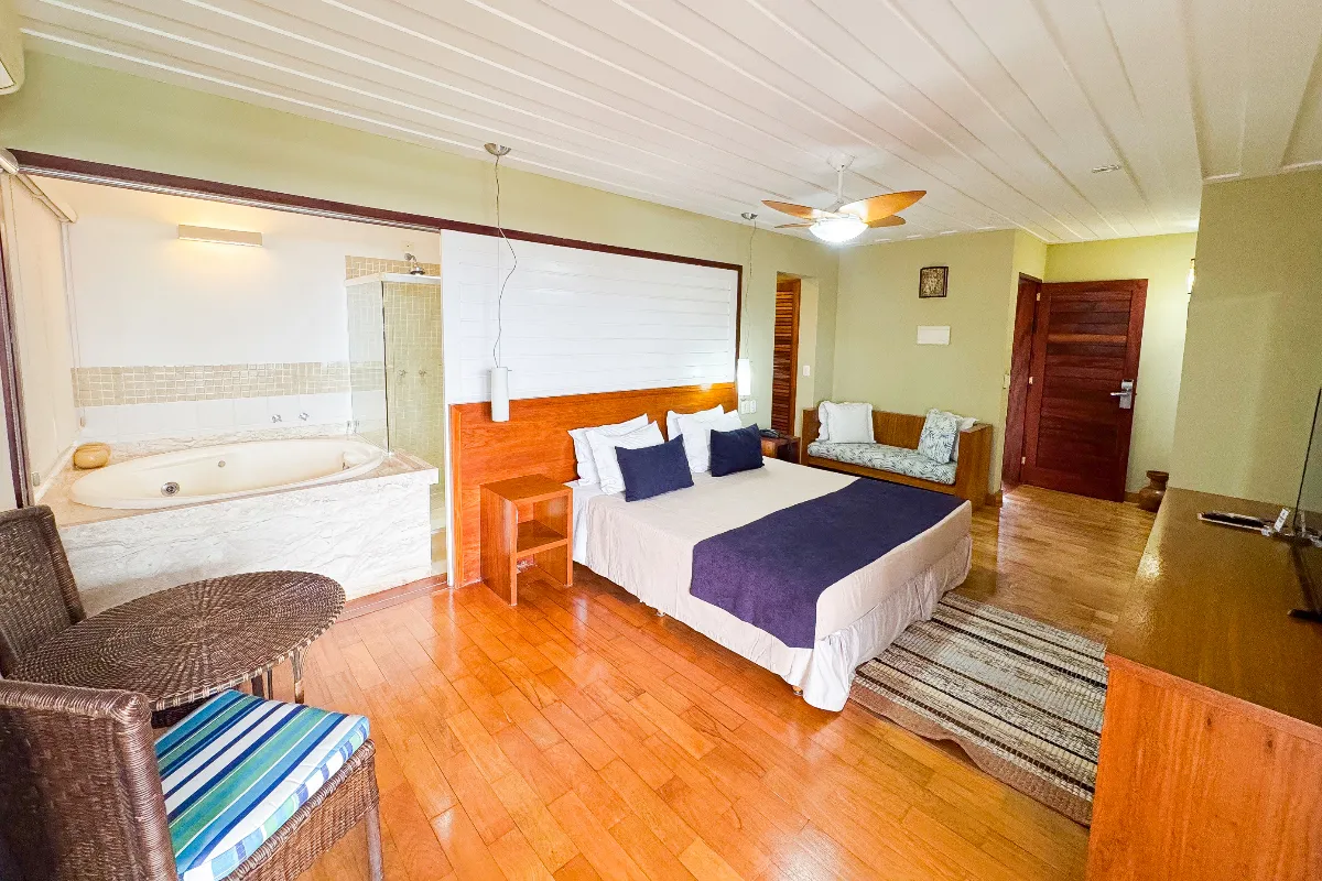 As Suítes Master Anexo possuem ar condicionado split master, ventilador de teto, frigobar, telefone, cama king size, travesseiros com plumas de ganso, banheira de hidromassagem, ducha com aquecimento central, TV Smart 43″polegadas +TV Samsung e secador de cabelo.